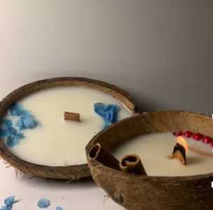 Самодельные свечи из скорлупы кокоса, натуральный кокосовый воск, деревянный фитиль с эффектом камина.